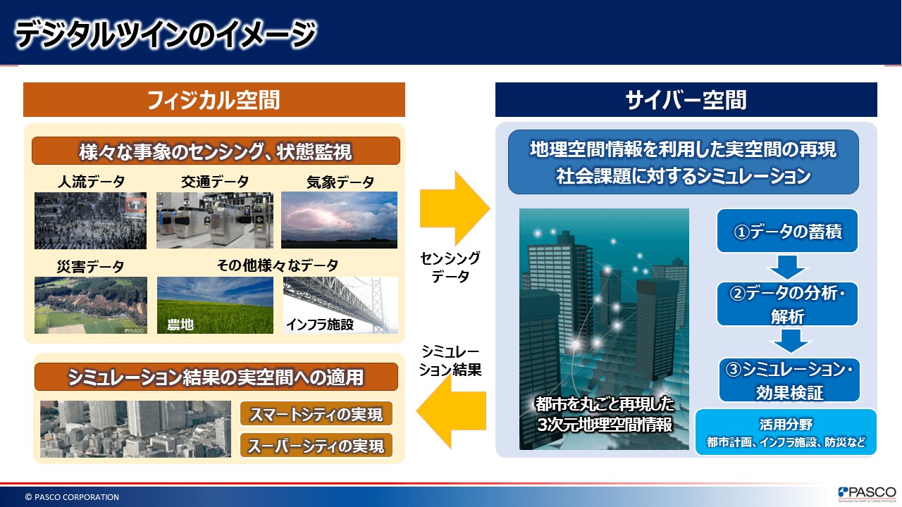 デジタルツインとは、現実世界(フィジカル空間)と全く同じ環境を仮想空間(サイバー空間)上に再現する技術です。もともとは製造業の工場や建設現場など、ものづくり分野に導入され、試作や開発コスト削減、品質向上、危険予知などに大きな効果を発揮してきました。現在ではデジタルツインは、都市空間を丸ごと3次元地理空間情報として再現し、インフラ施設管理等のアセットマネジメントの高度化・効率化など広範な領域での活用が注目されています。